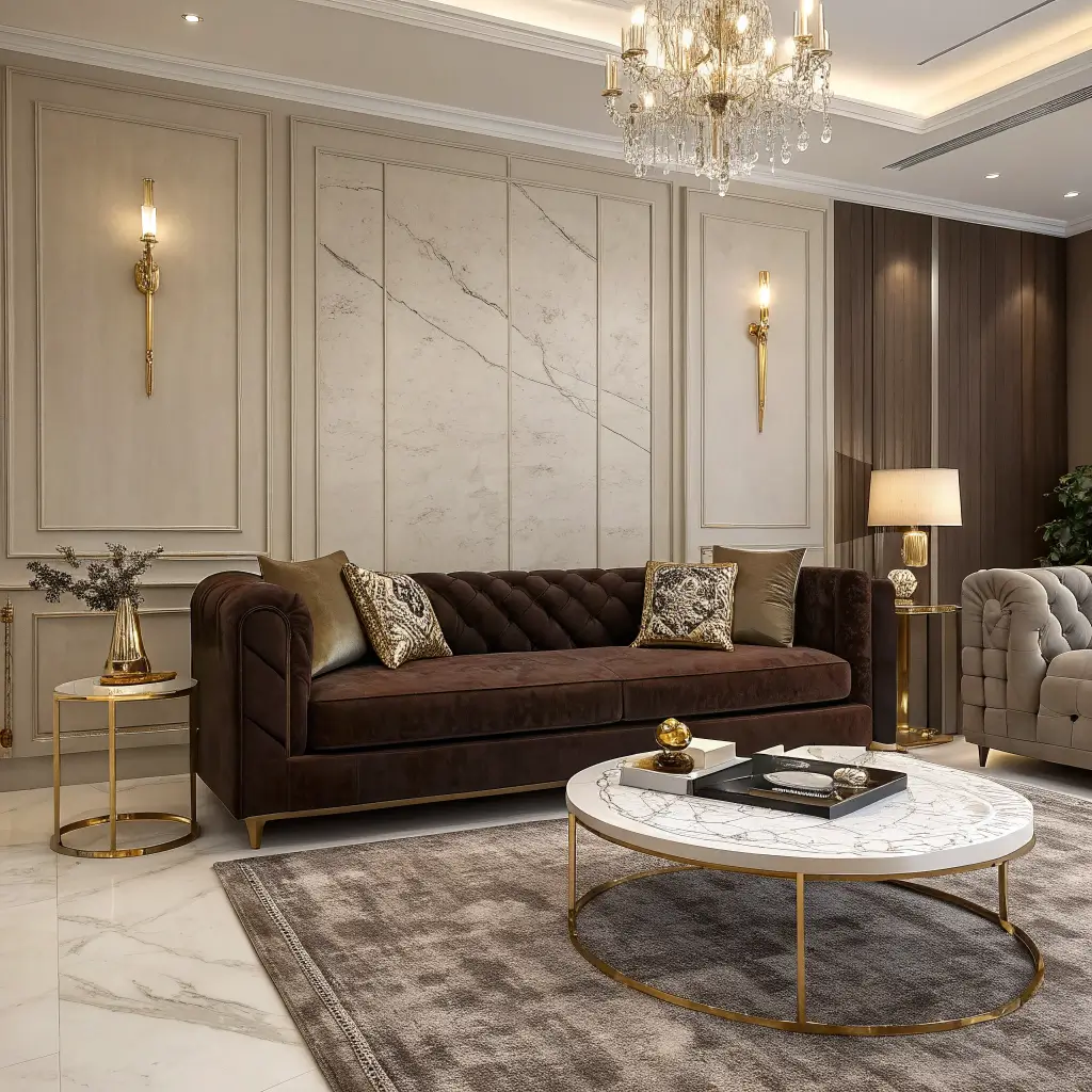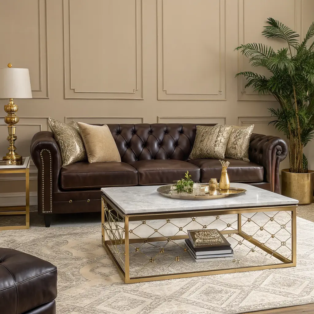 - Incorporate marble surfaces (coffee table or side tables)
