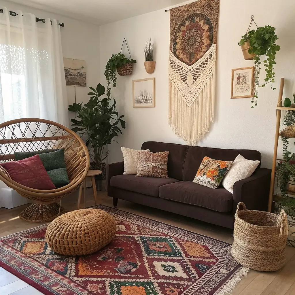 Boho Chic Living Room with Dark Brown Sofa