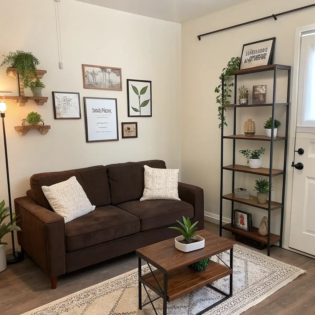 Add patterns through pillows, rugs, and art. Mix scales – large geometric with small florals, for instance. The brown couch acts as your constant, letting everything else play.