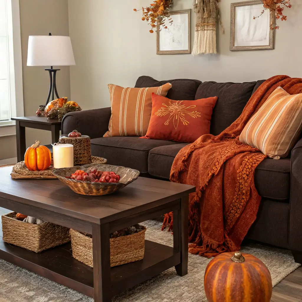 When fall rolls around, your dark brown couch becomes the MVP of seasonal decorating. It’s already giving those cozy autumn vibes year-round!