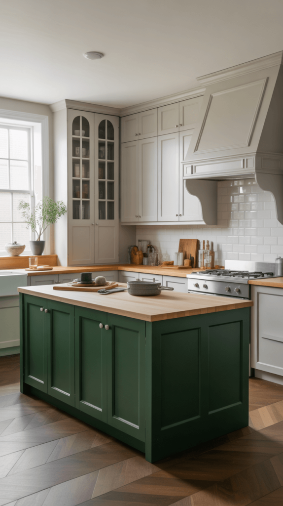 Not ready to commit to a full set of green cabinets? I feel you. A green island is the perfect compromise. It gives you that hit of color and personality without overwhelming the space. It instantly creates a focal point and defines the work zone.