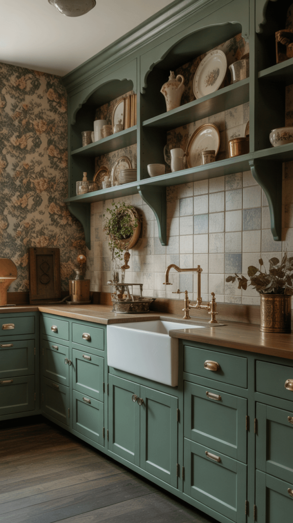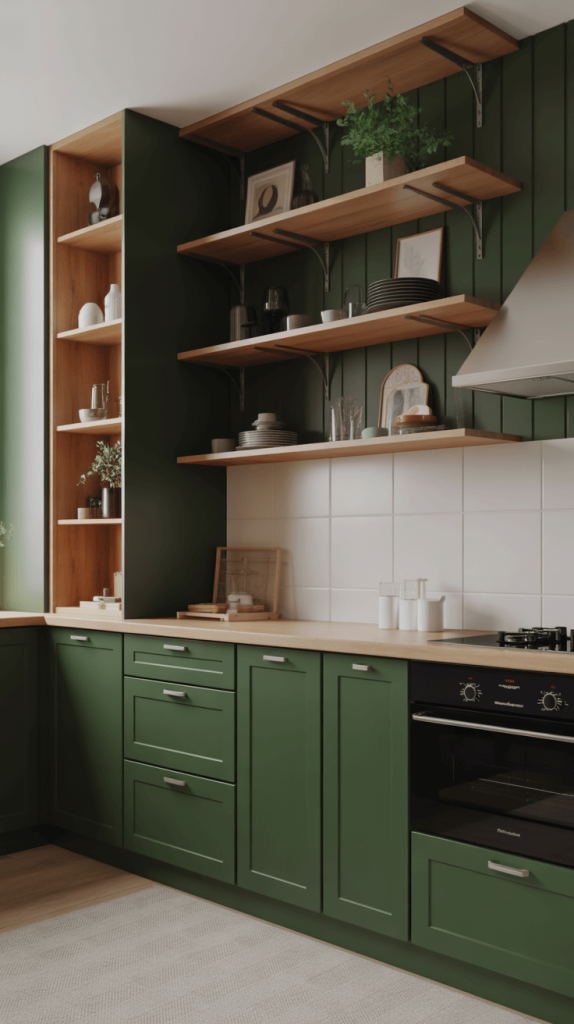 You can use floating wood shelves to warm up the space or white shelves to make them blend seamlessly with the wall. Style them sparingly—a few stacks of plates, a nice oil cruet, a small plant. This keeps the look curated, not cluttered. It’s functional, stylish, and keeps your dark green kitchen feeling airy.