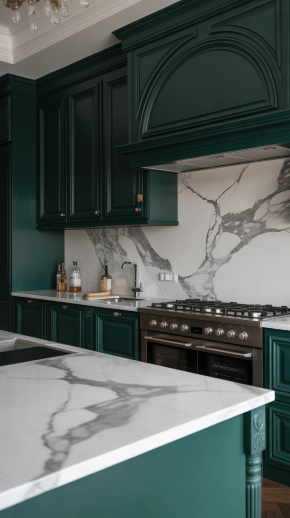 9. Pure Luxury: Dark Green with Marble Countertops for Luxe Feel