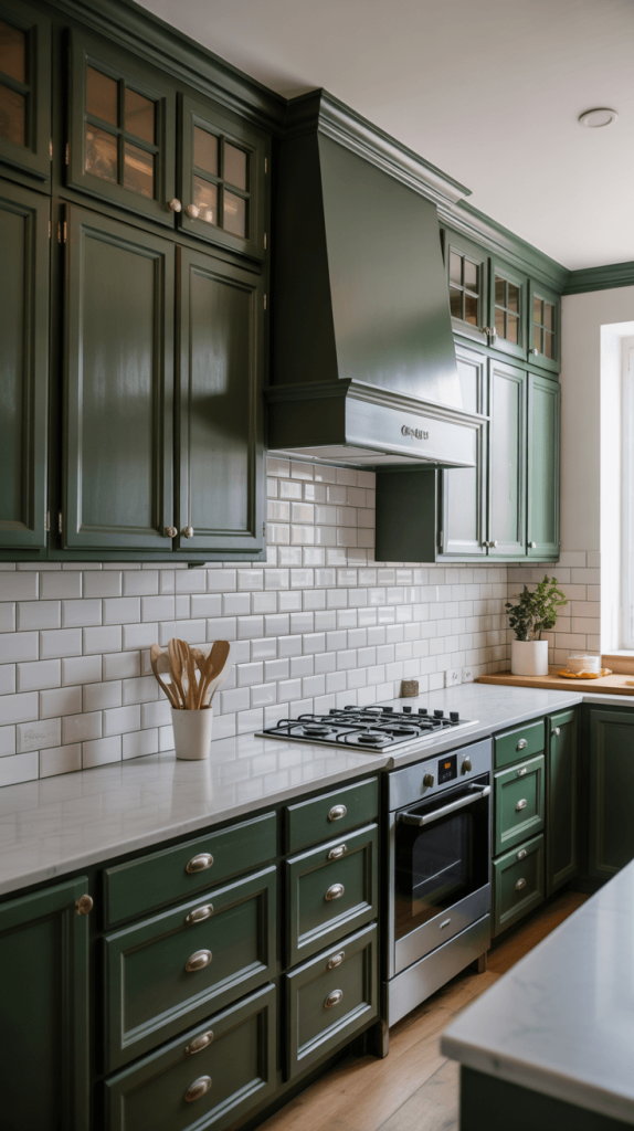 Think dark green cabinets, either on the lower half or all over, paired with bright white walls, a pristine white subway tile backsplash, and maybe a white marble or quartz countertop. The white keeps everything feeling open, airy, and clean, while the green brings the drama and sophistication. It’s the culinary equivalent of wearing a classic black dress with a statement piece of jewelry. You simply cannot go wrong.