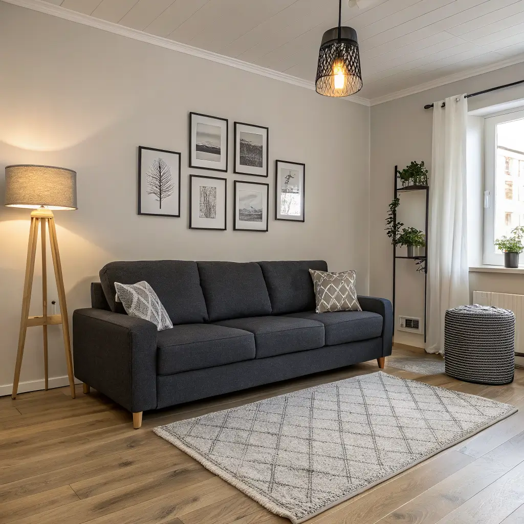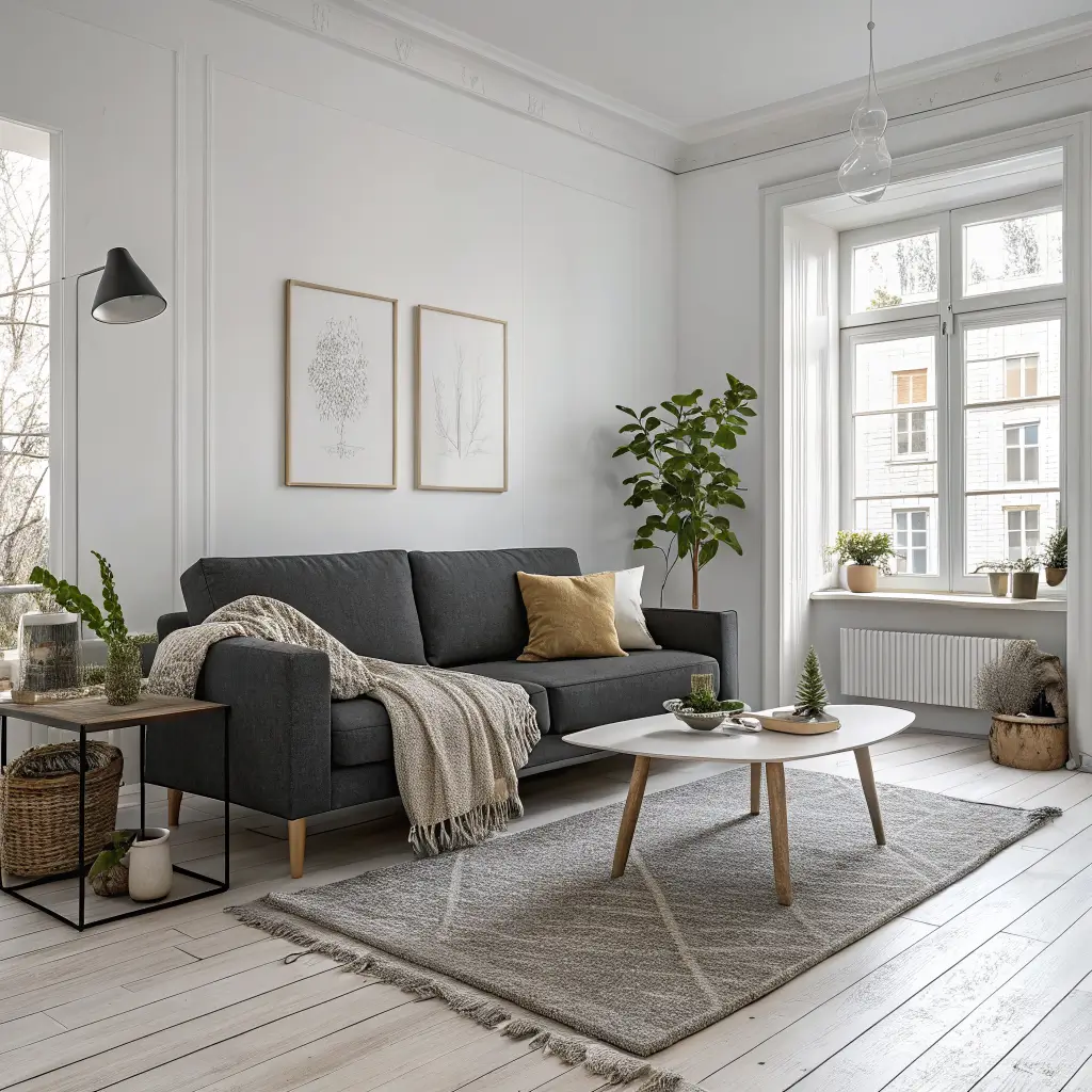 Start with your dark grey couch as the anchor piece. Add a light-colored coffee table – I’m partial to white oak or birch â€“ and keep your walls bright white. The contrast creates visual interest without adding clutter.