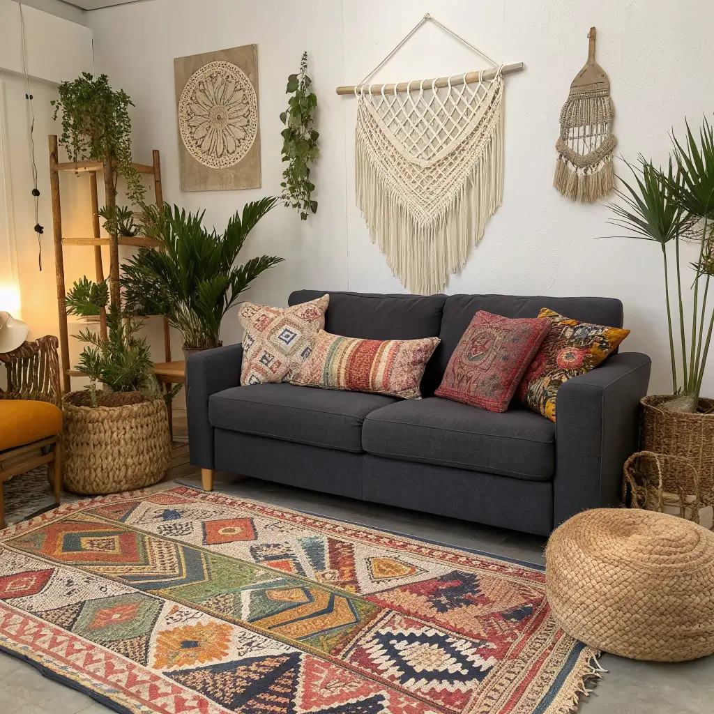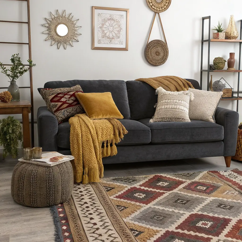 Who says bohemian style needs to be all earth tones and brown leather? Pairing a dark grey couch with boho elements creates this unexpectedly sophisticated twist on the typical bohemian living room. It’s like your couch went to business school but still knows how to party on weekends.