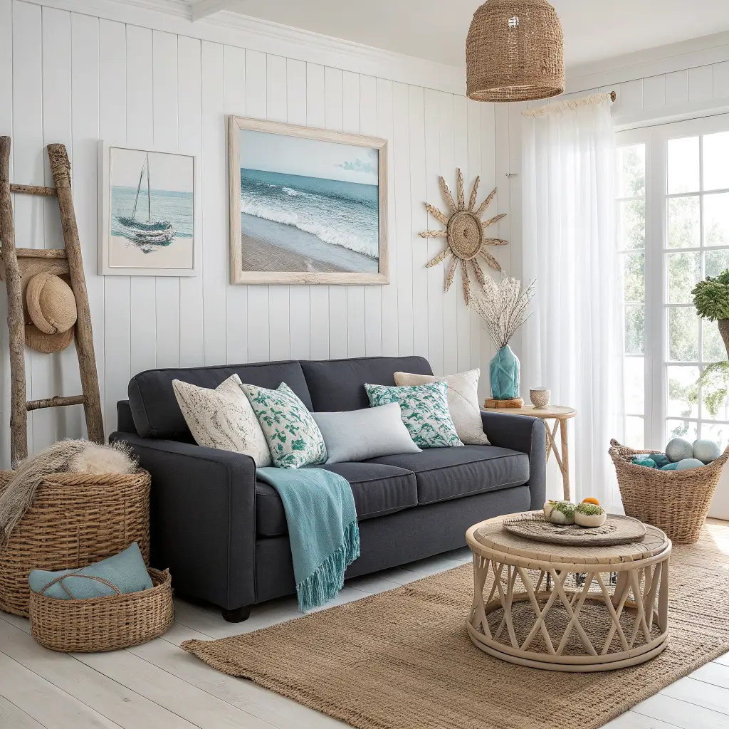 Who says coastal style needs to be all white and blue? A dark grey couch brings unexpected sophistication to beach-inspired decor while still maintaining that relaxed, vacation-home vibe.