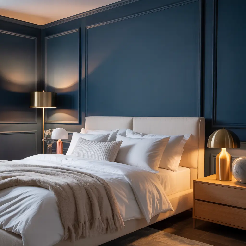 Want to know what makes people stop mid-conversation when they walk into your bedroom? A deep navy accent wall paired with gold or copper metallic accents. This combo hits different—it’s sophisticated without trying too hard, and it photographs like a dream (hello, Instagram!).