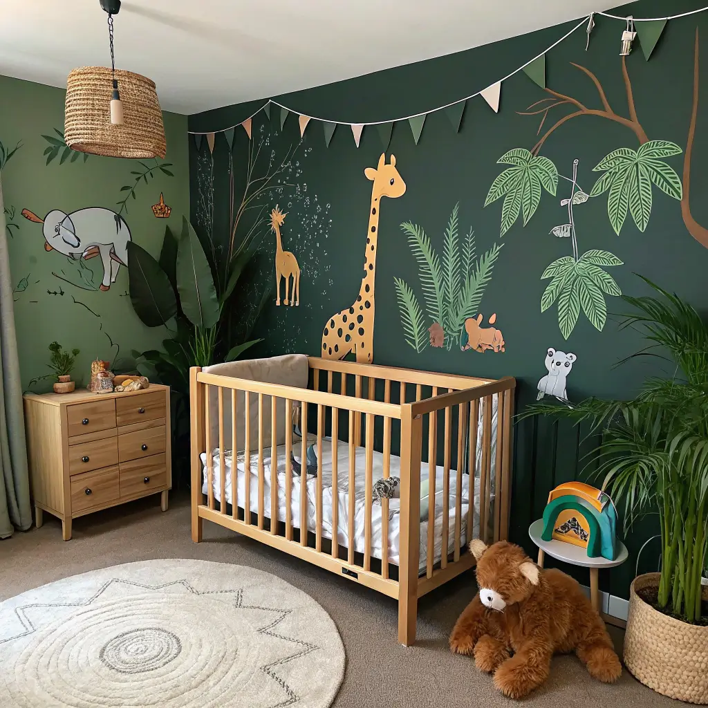 The furniture can go either way – natural wood for an authentic feel, or black/dark pieces for drama. What really sells this theme are the details: a canopy over the crib to create that jungle tent feel, animal-print pillows, maybe even a small teepee in the corner. My cousin did this theme and added a stuffed animal hammock in the corner – genius storage solution that adds to the adventure vibe!