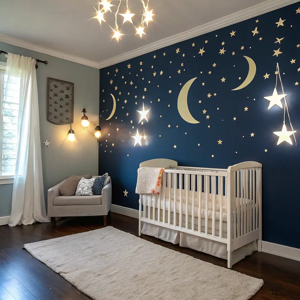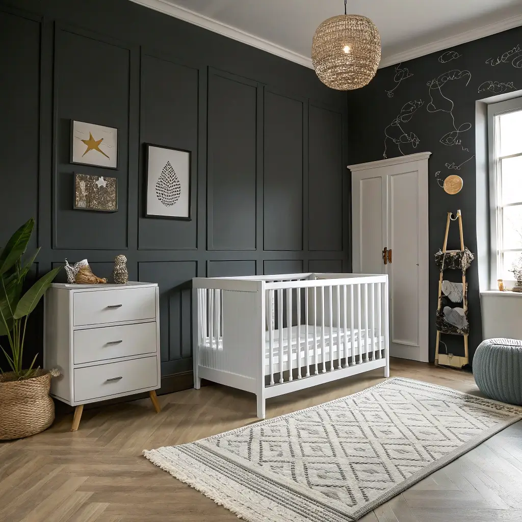 For furniture, white or light wood cribs create beautiful contrast against those dark walls. But here’s my secret weapon: glow-in-the-dark star stickers on the ceiling. Your kid will thank you for this when they’re three and obsessed with space. Trust me on this one – my nephew still talks about his “magic ceiling” years later.