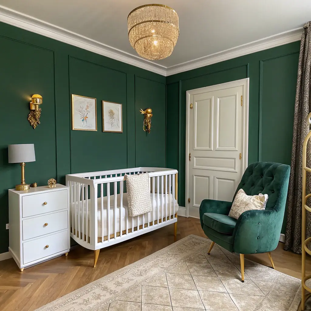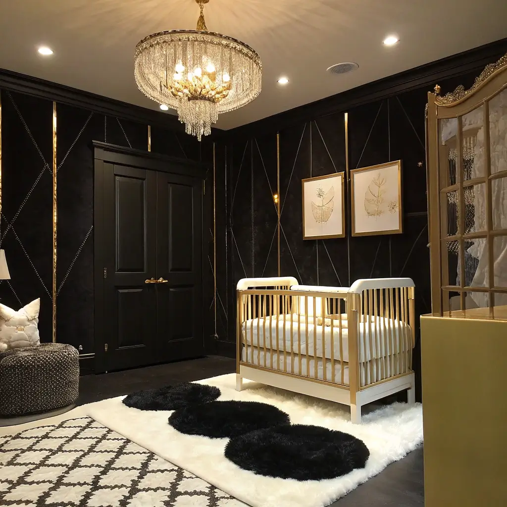 Metallic accents are essential here – gold, silver, or rose gold hardware, frames, and lighting prevent the room from feeling flat. Add in mirrors to reflect light and create the illusion of space. Crystal elements like a small chandelier or crystal drawer pulls add that luxury hotel vibe. White or cream bedding keeps things from feeling too heavy and provides necessary contrast for baby’s developing vision.