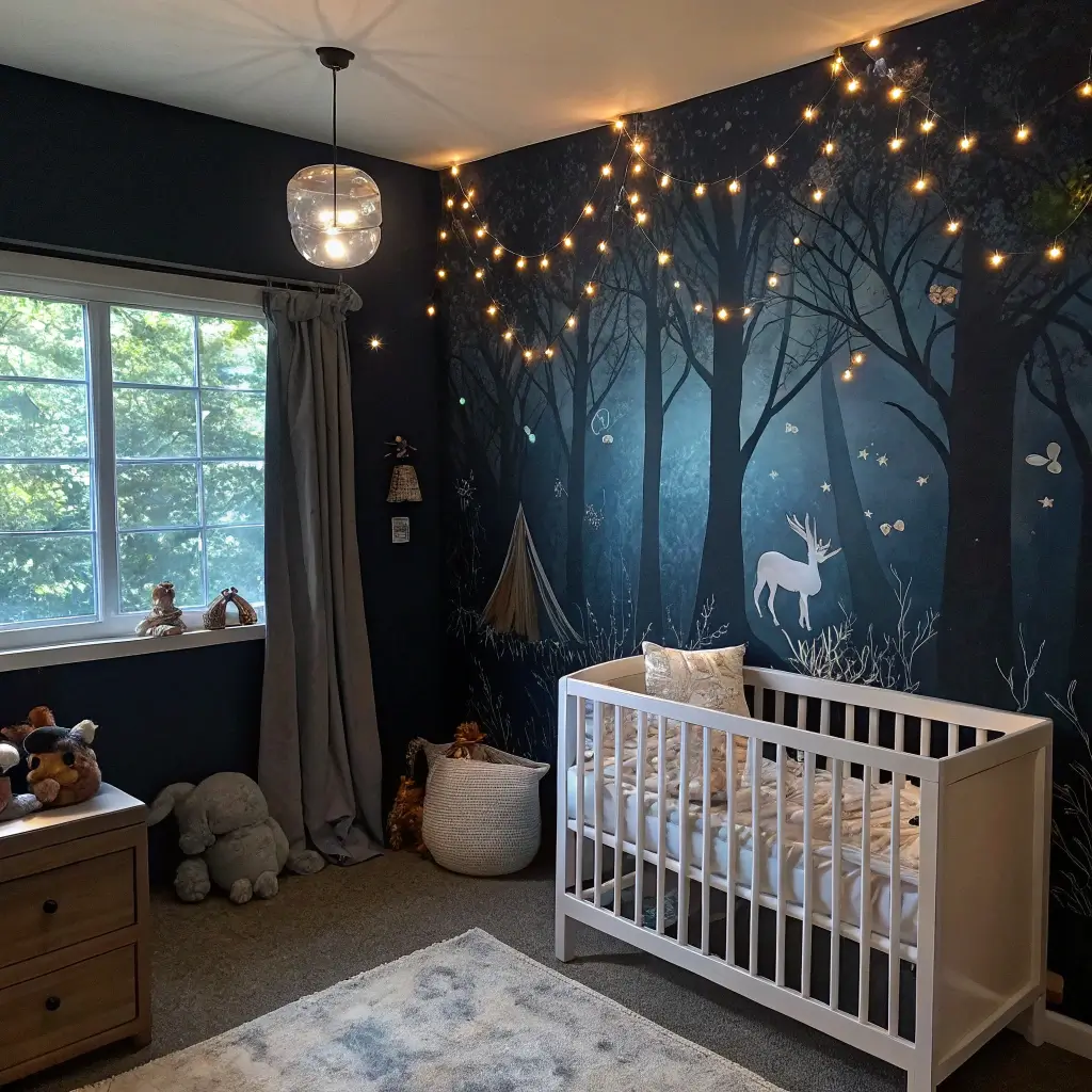 The key to keeping it baby-appropriate is softening those dramatic elements. Incorporate soft textures through velvet cushions, faux fur throws, and plush rugs. Add whimsical touches like moon and star motifs, or fairy tale artwork. One mom I know did this theme with subtle Harry Potter elements woven in – it’s mysterious and magical without being overwhelming.