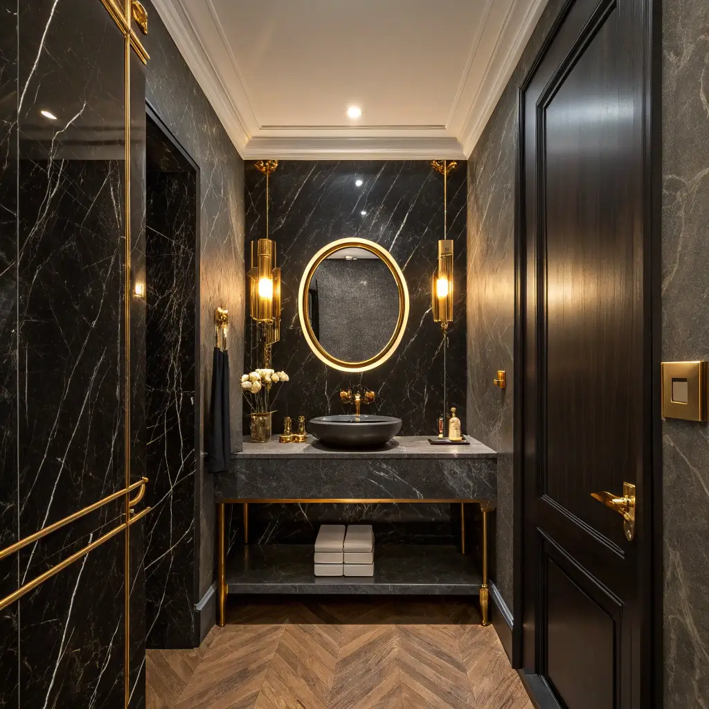 The ratio matters here. Too much gold looks gaudy; too little looks incomplete. I stick to the 70/30 rule – 70% black, 30% gold accents. This might mean gold fixtures, mirror frames, and light fixtures against black walls and vanity.