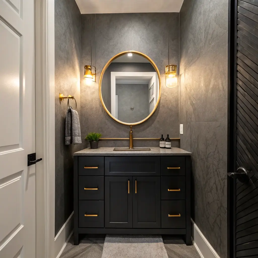 Metallic wallpaper behind the mirror creates a focal point without covering every wall. Or try black walls with gold-veined black marble – sophisticated and unexpected.