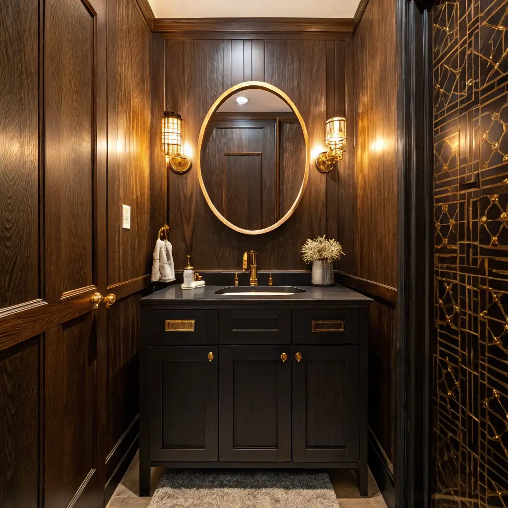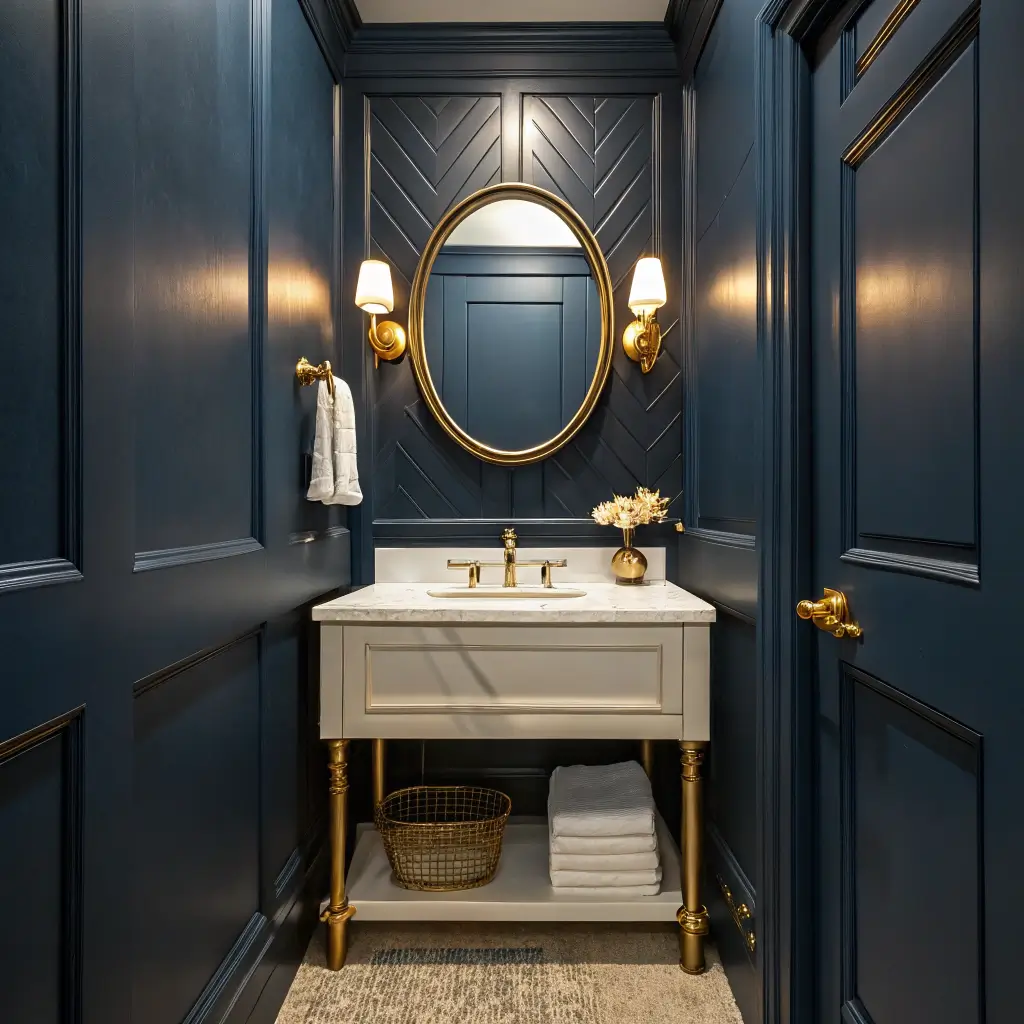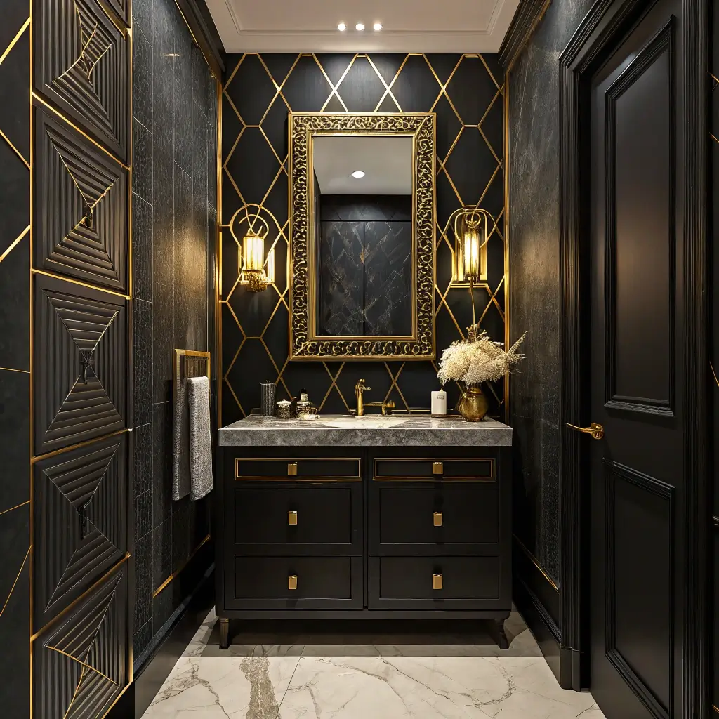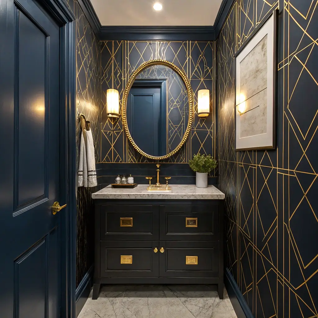 Channel Great Gatsby vibes with midnight blue and Art Deco elements. I created an Art Deco powder room using geometric wallpaper, brass fixtures, and a sunburst mirror – it’s basically a time machine to 1920s glamour.