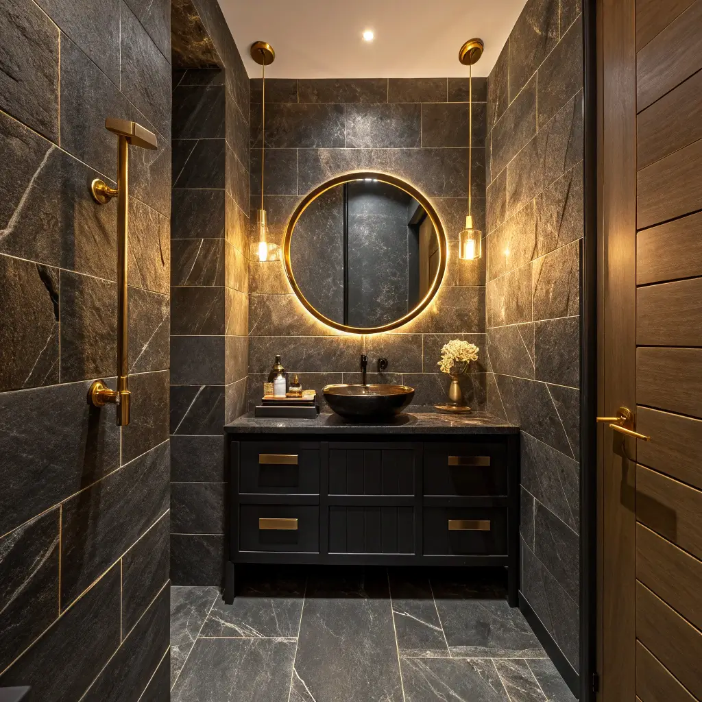 Create your own mini spa with dark stone surfaces. I designed a powder room using black slate tiles and it literally feels like a high-end spa. The natural texture and color variation in real stone adds this organic luxury you can’t fake.