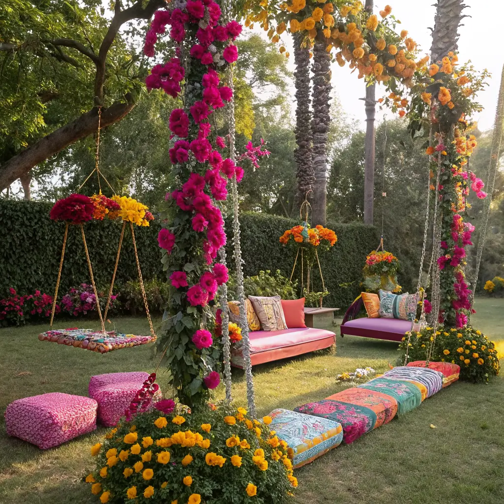 The color scheme should scream happiness – think vibrant yellows, hot pinks, and fresh oranges with touches of green foliage. Remember, this is the fun function where everyone’s supposed to let loose! Set up low seating areas with colorful floor cushions and bolsters. Those traditional khatias (charpoys) wrapped in bright fabrics? They’re making a comeback, and honestly, they’re both comfortable and photogenic.