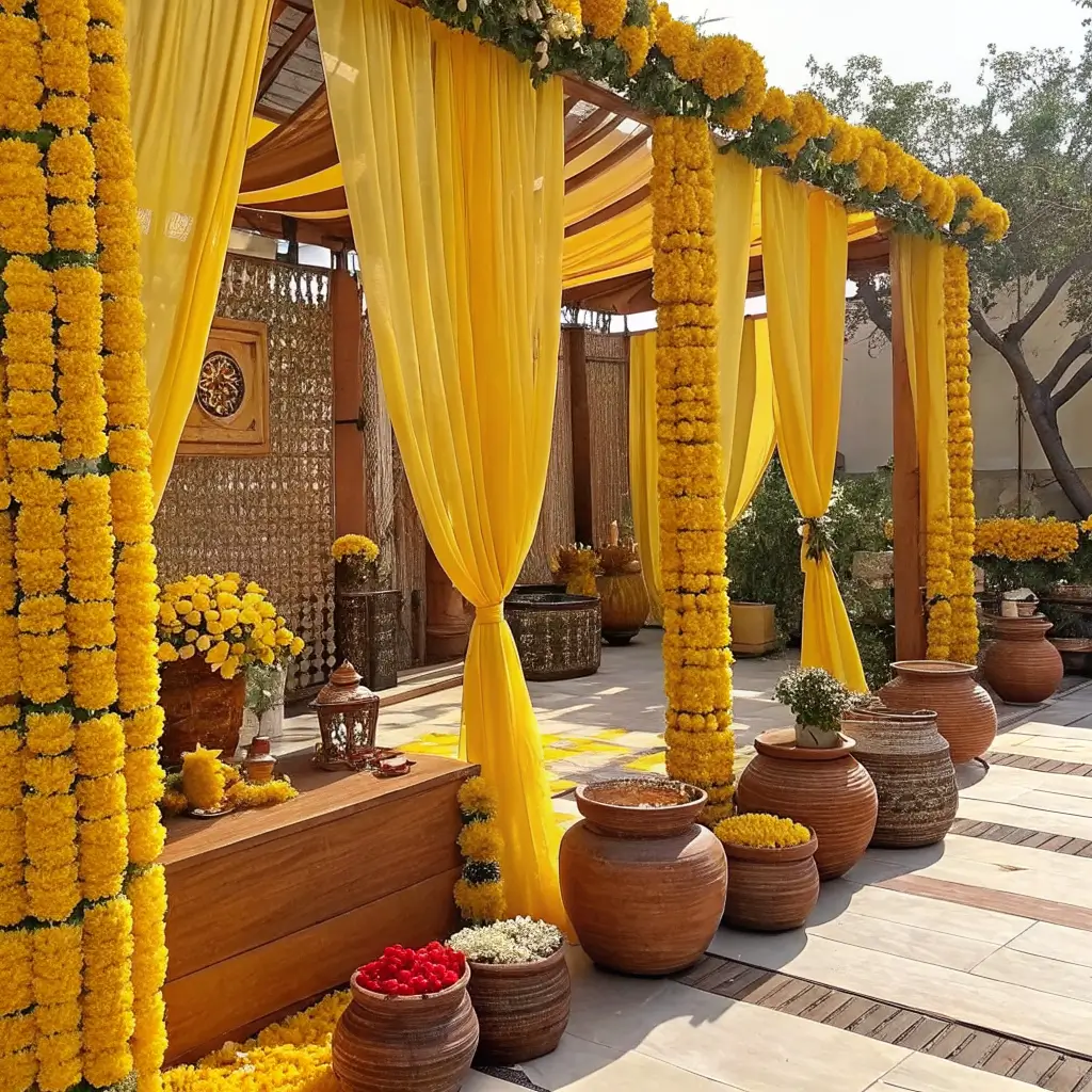 Let’s get real – haldi ceremonies are messy, chaotic, and absolutely perfect for going all-out with traditional decor. This is where you can embrace every desi decor cliché and actually make it work! The star of the show? Marigolds, obviously. But we’re not talking about your basic marigold strings here.
