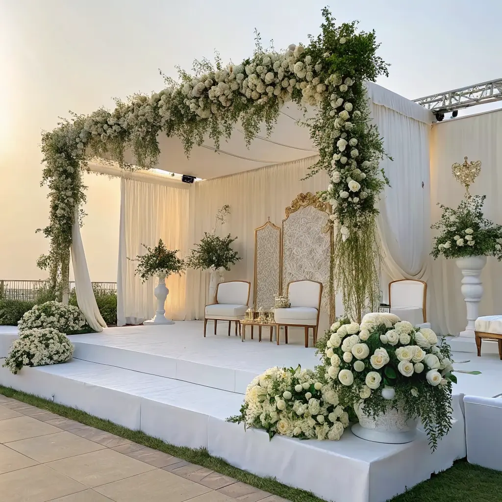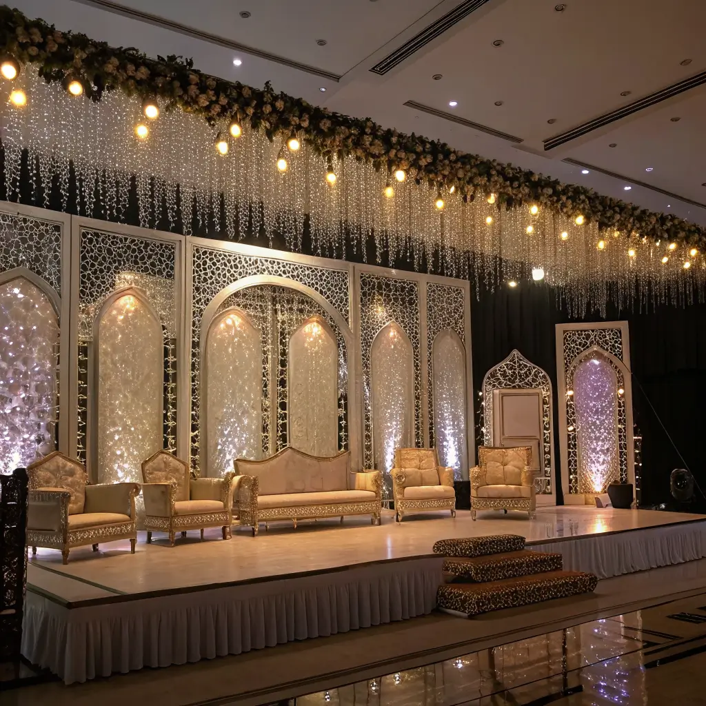 IMO, this theme works best in venues with good bones. You’re not trying to hide anything; you’re enhancing what’s already there. The stage backdrop should be elegant but understated – perhaps a simple geometric frame with strategic greenery. Let the couple be the stars, not the decor competing for attention.