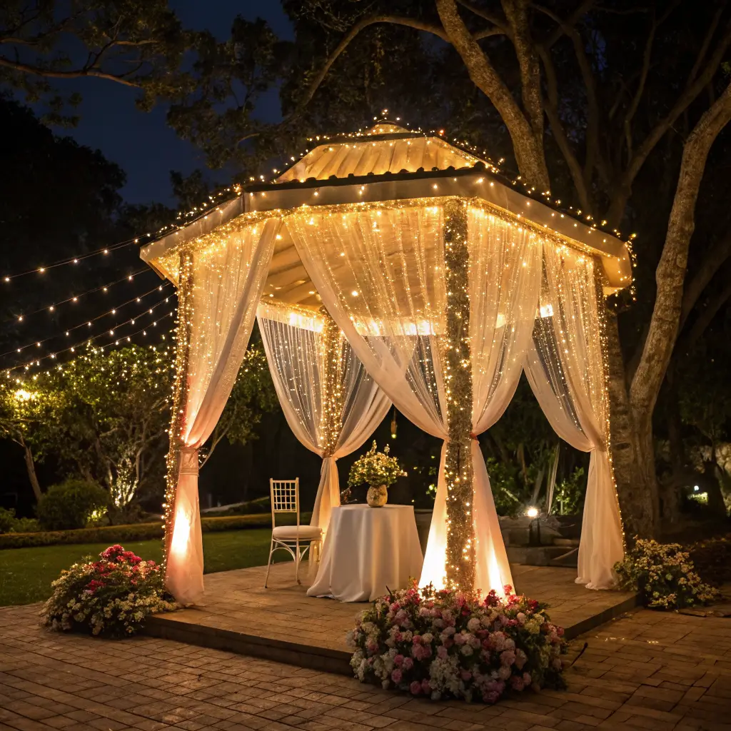 The magic happens when you combine lights with sheer fabric. Translucent draping diffuses the light beautifully and creates that dreamy, soft-focus effect in photos. Add some suspended elements – maybe paper lanterns, geometric shapes, or even flowers – to create visual interest at different heights.