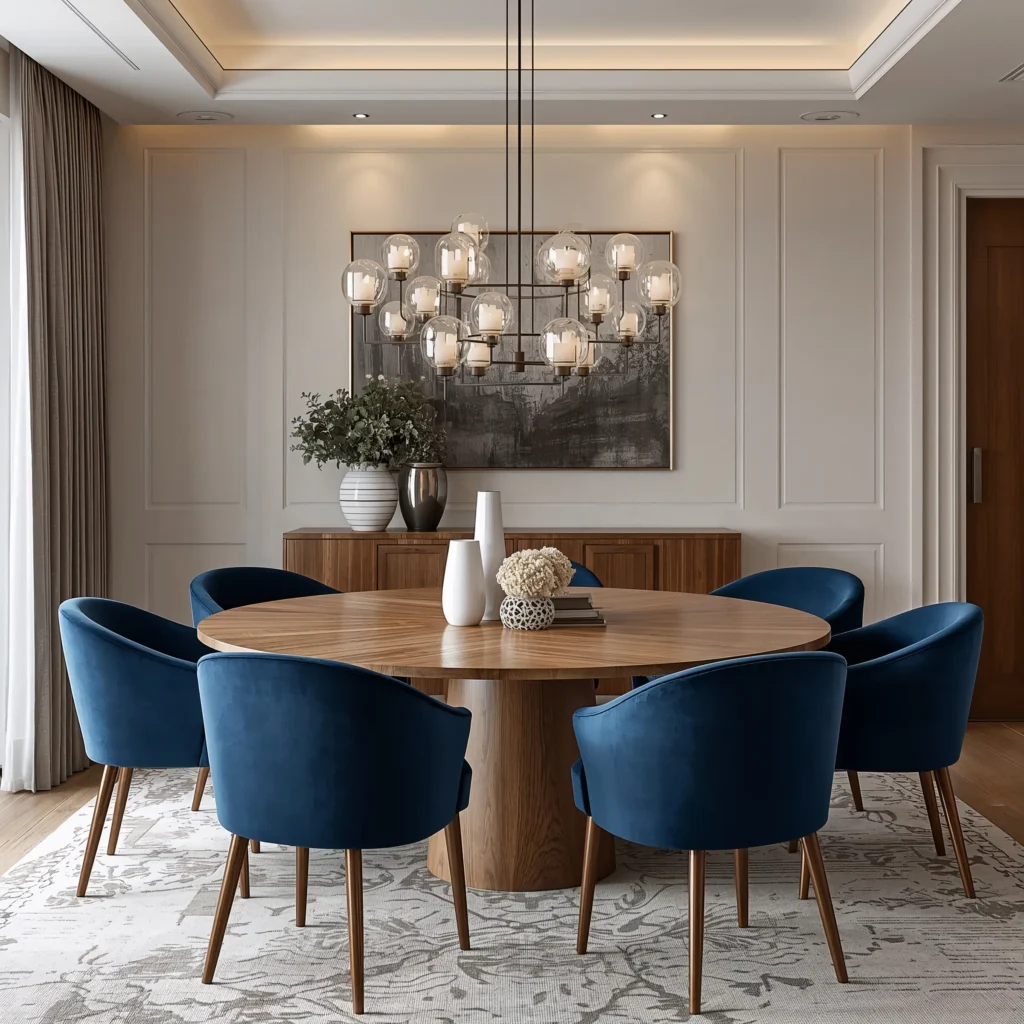 I helped design a dining space last month featuring a solid walnut round table surrounded by emerald green velvet chairs. The contrast between the natural wood grain and luxurious fabric created this perfect balance between organic and opulent.