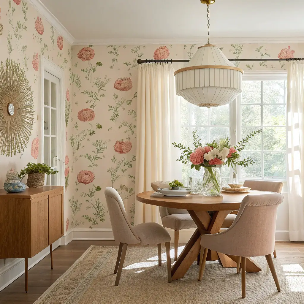 Who says florals are just for grandma’s house? Modern floral wallpapers have seriously evolved, and they bring this amazing warmth to dining spaces. Large-scale botanical prints feel contemporary and fresh, while delicate vintage-inspired florals create that English garden tea party atmosphere we all secretly crave.