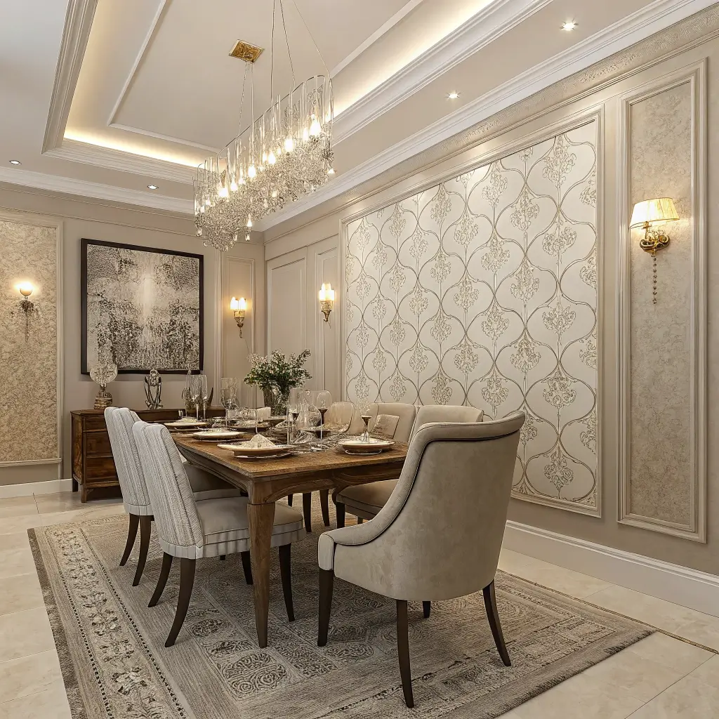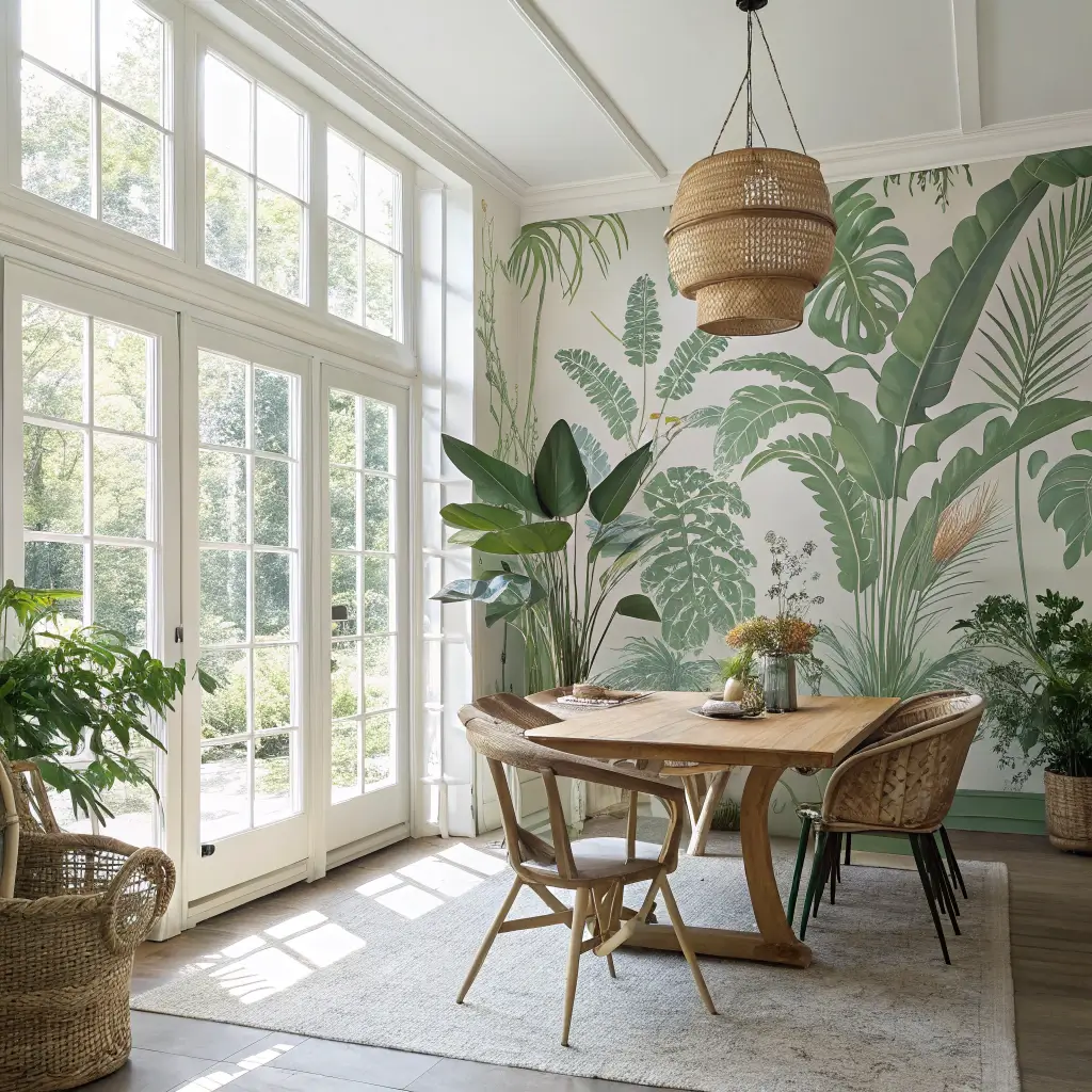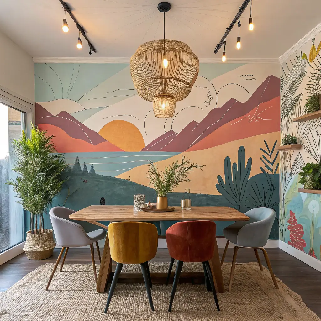 Mural wallpapers turn dining rooms into destinations. Cityscapes, landscapes, abstract art – these large-scale designs become the room’s focal point. Choose something you genuinely love because you’ll look at it every single day.