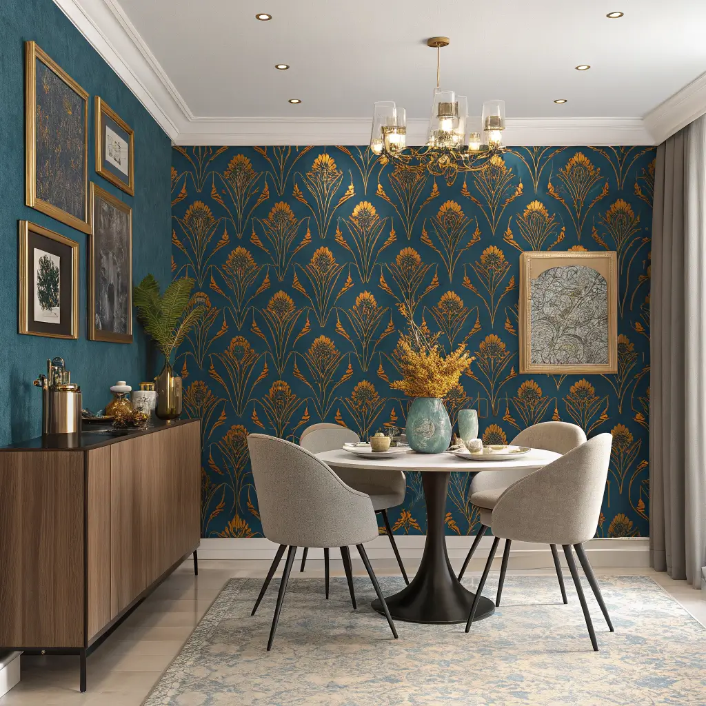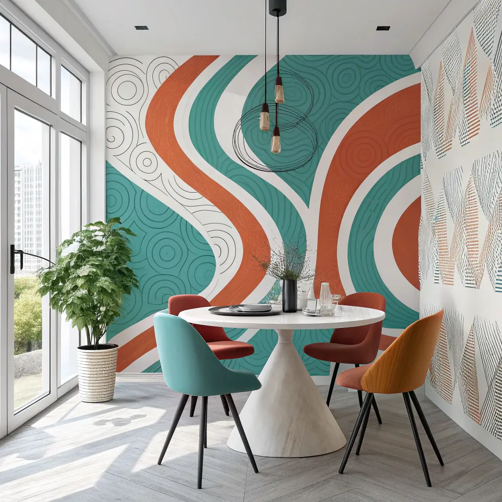 Abstract wallpapers transform dining rooms into galleries. These designs don’t follow rules – they create mood through color, shape, and movement. Every meal becomes an experience when you’re surrounded by art.