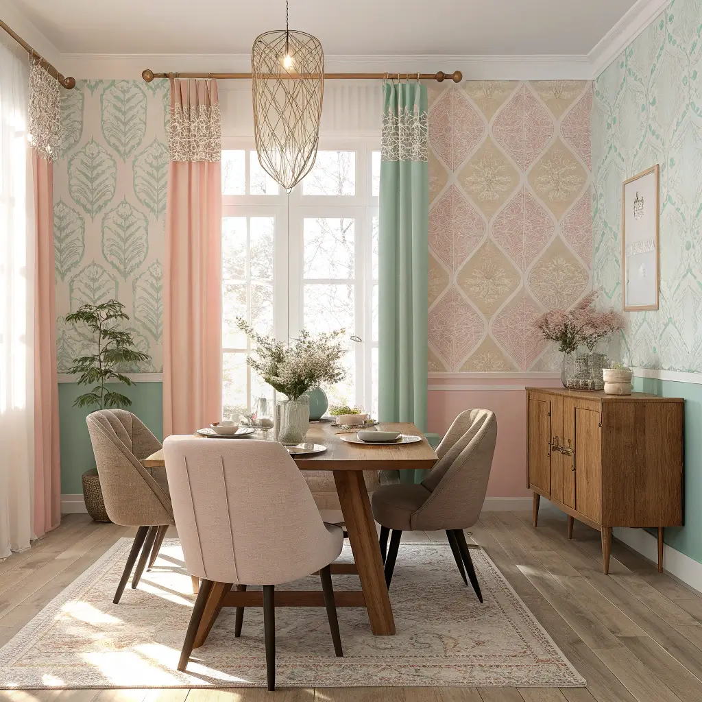 Pastel wallpapers wrap dining rooms in warmth without overwhelming. Blush pinks, soft blues, mint greens, buttery yellows – these colors make everyone look good under dining room lighting (and that’s not nothing, FYI). Pastels work especially well in rooms lacking natural light.