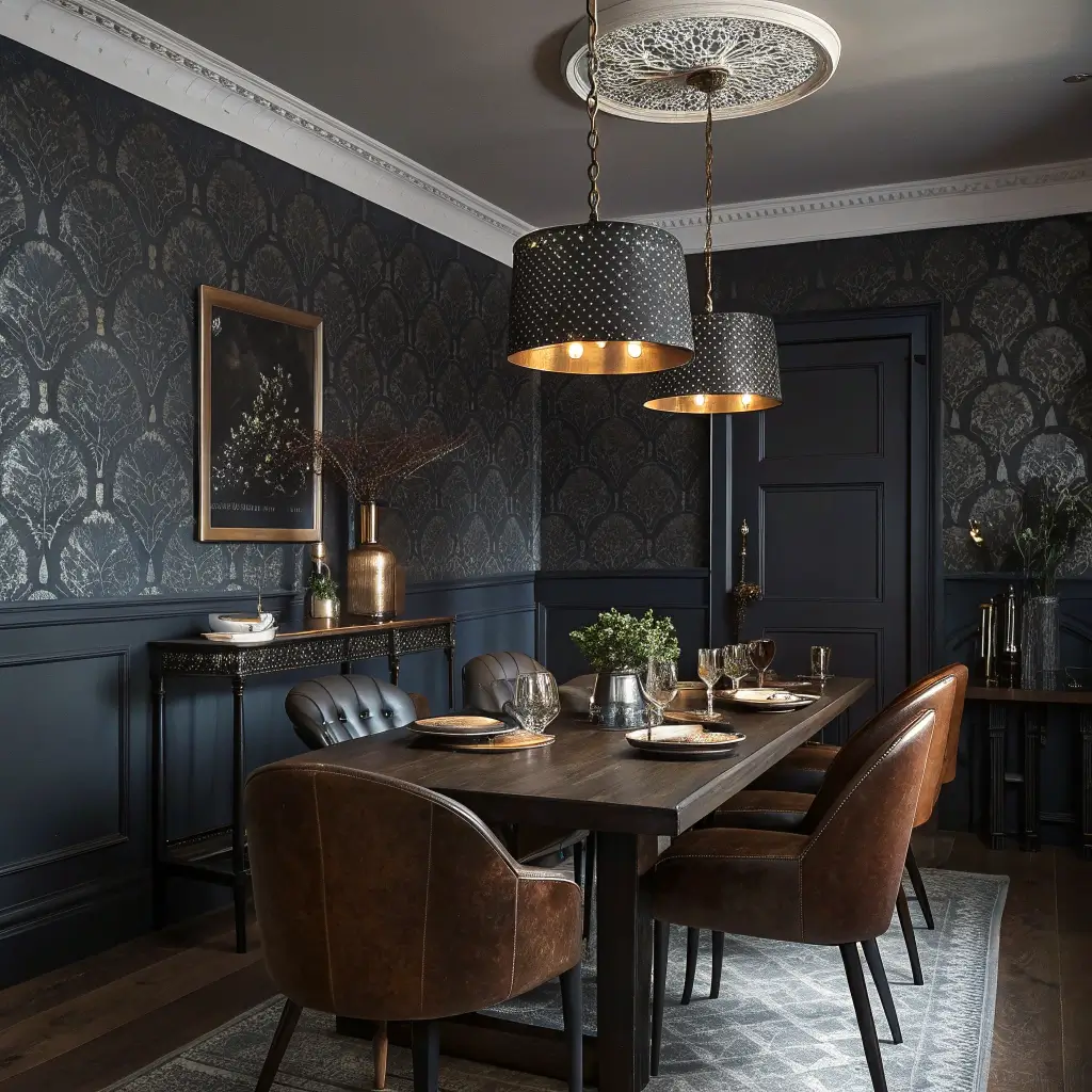 Dark wallpaper creates intimacy and sophistication that light colors simply can’t achieve. Navy, charcoal, deep green, even black – these colors make dining rooms feel like exclusive speakeasies. The key? Proper lighting becomes absolutely crucial.