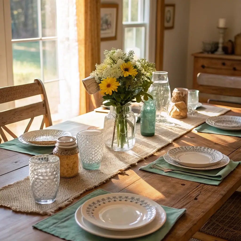 Layer your table with burlap table runners or simple linen in neutral tones. I discovered this trick accidentally when I forgot to iron my fancy tablecloth – turns out, wrinkled linen looks intentionally rustic. Who knew?
