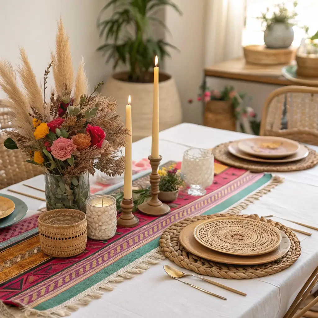 Start with layered textiles. Throw a colorful runner over a neutral tablecloth, add some macramé placemats, and maybe even drape a throw blanket over one chair. The goal is comfortable abundance.