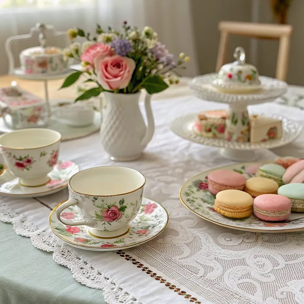 Fresh flowers in teapots or sugar bowls make perfect centerpieces. Choose cottage garden varieties like roses, sweet peas, or peonies. The arrangements should look slightly wild, like you just picked them from an English garden.