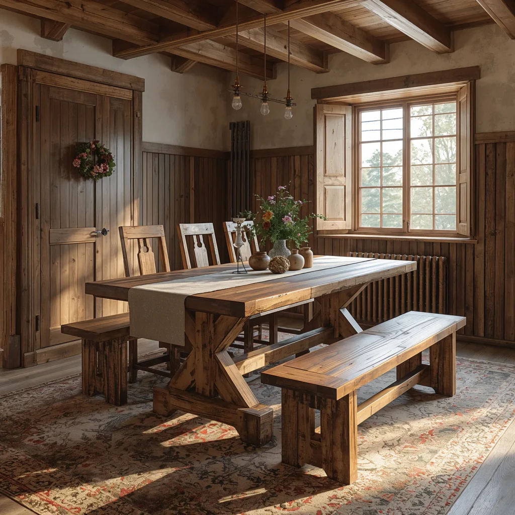 I discovered this style at a beach house rental, where the owners had brought classic picnic table benches inside. Sounds weird? It was absolutely perfect. The thick wooden planks, the sturdy A-frame supports, the way everyone immediately relaxed around it – pure genius.