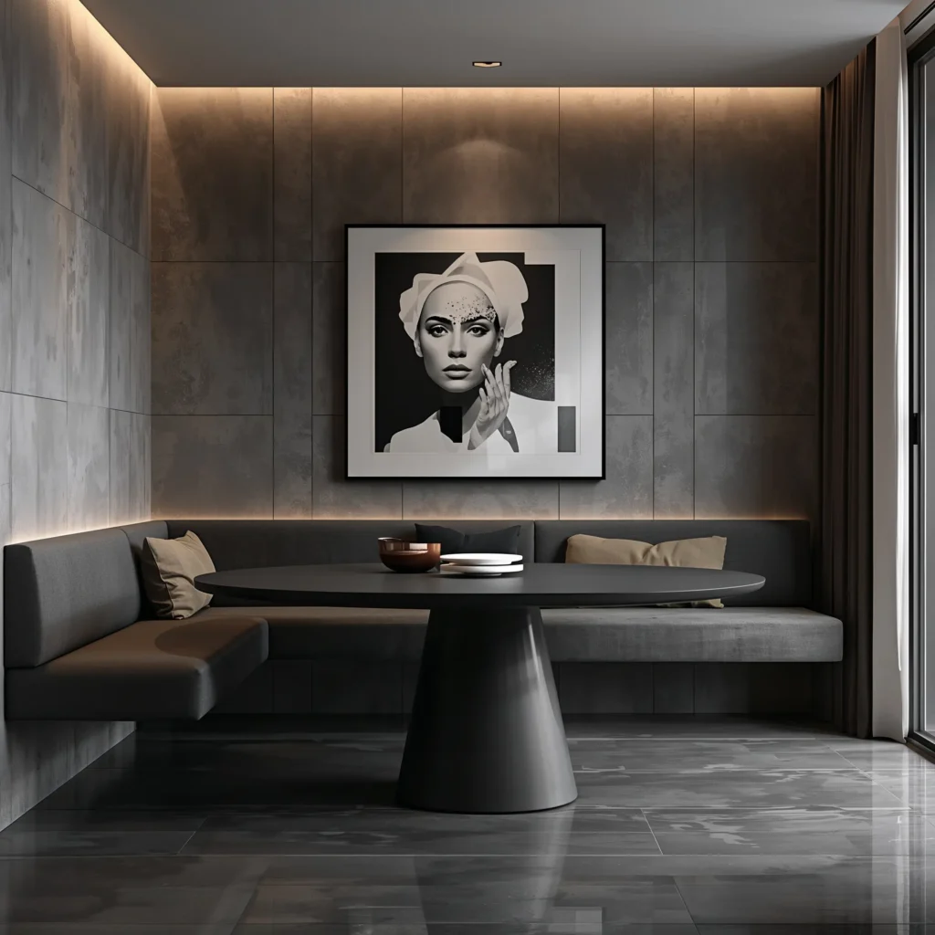 This setup pushes your table against the wall with a sleek bench running along it. The magic happens when you realize you’ve just freed up half your floor space. No more chairs jutting out into walking paths or creating visual clutter.