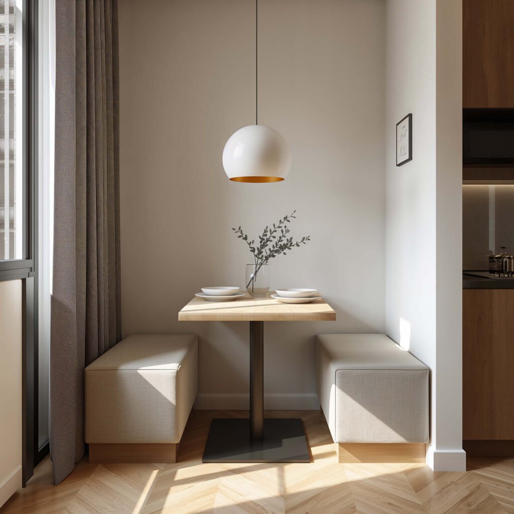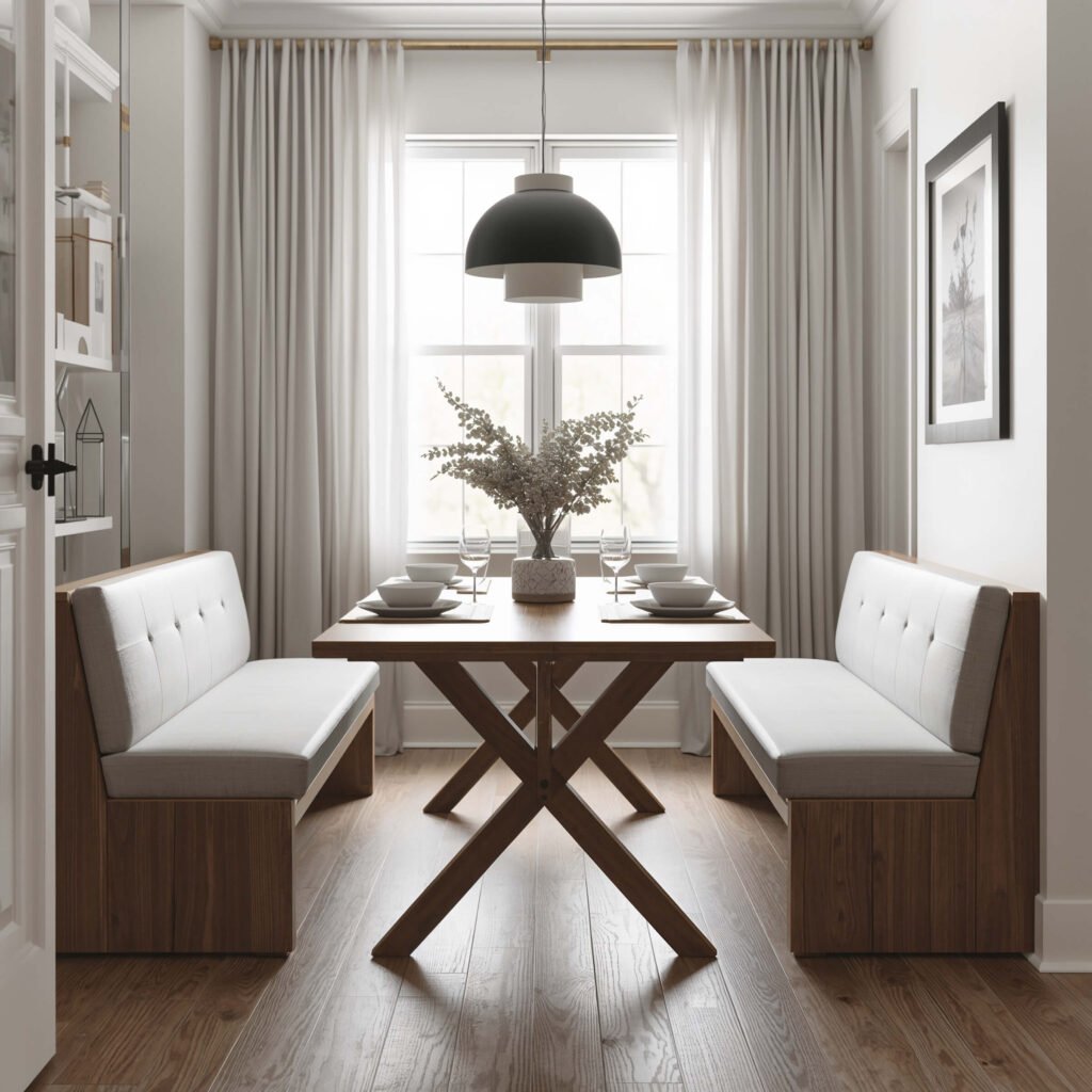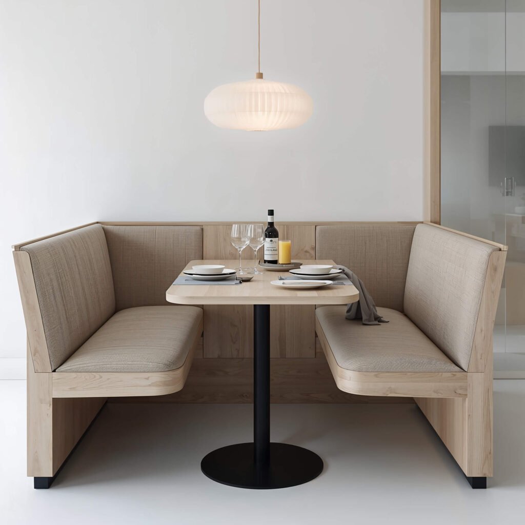 I helped my neighbor design a corner bench setup, and now I’m slightly jealous every time I visit. The L-shaped bench wraps around two sides of the table, creating this perfect little dining cocoon. Add some plush cushions and soft lighting, and you’ve basically built a hug you can eat in.