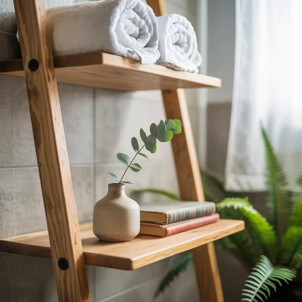 I snagged mine from a garage sale for $10, gave it a good sanding, and leaned it against my bathroom wall. No installation required – just lean and load. Each rung holds rolled towels, and the top’s perfect for a plant or decorative basket.
