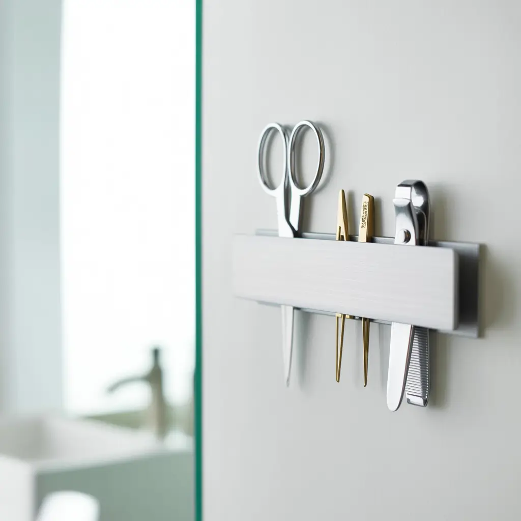 I mounted mine inside my medicine cabinet door. Now my tweezers, nail clippers, scissors, and bobby pins all have a home. No more digging through drawers trying to find that one specific tool when you’re already running late.
