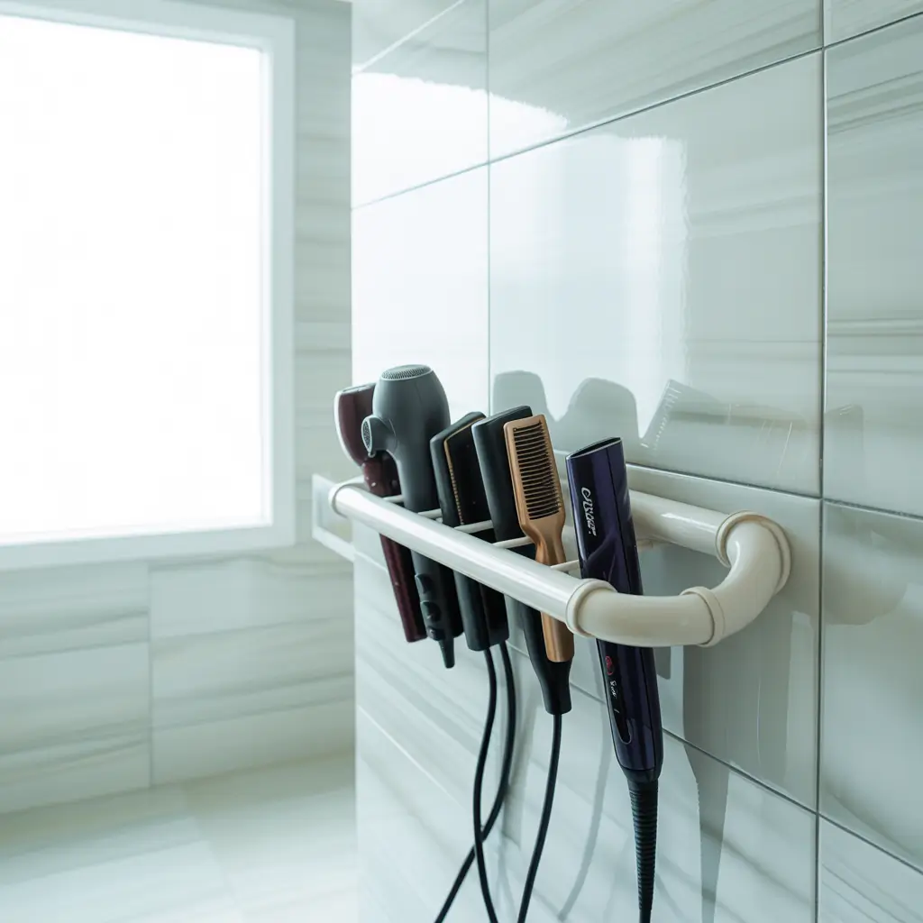 Your hair dryer, curling iron, and straightener don’t have to live in a tangled mess under the sink. PVC pipes create perfect holsters for all your hot tools.