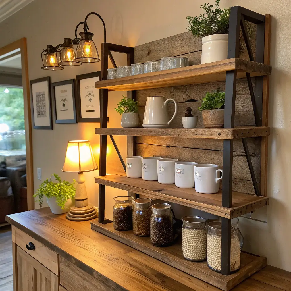 You’ll want to start with a solid wooden base – think floating shelves or a small console table. The beauty here lies in the imperfections. Those knots, grain patterns, and weathered edges? They’re not flaws; they’re character. Mount some wooden shelves at varying heights to create visual interest. I positioned mine at 12, 24, and 36 inches from the countertop, which gave me perfect spacing for mugs, beans, and my grinder.