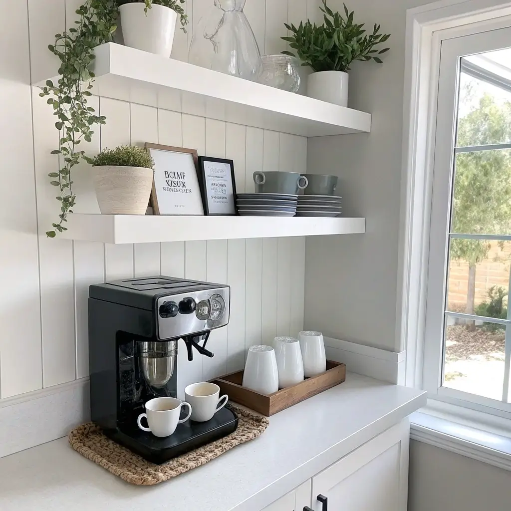 Start with white or light wood floating shelves – two or three maximum. You’re going for clean lines here, not a storage unit explosion. Mount them at eye level or slightly below. This setup works brilliantly because it forces you to curate your coffee accessories. No more random gadgets you bought at 2 AM on Amazon and never use.