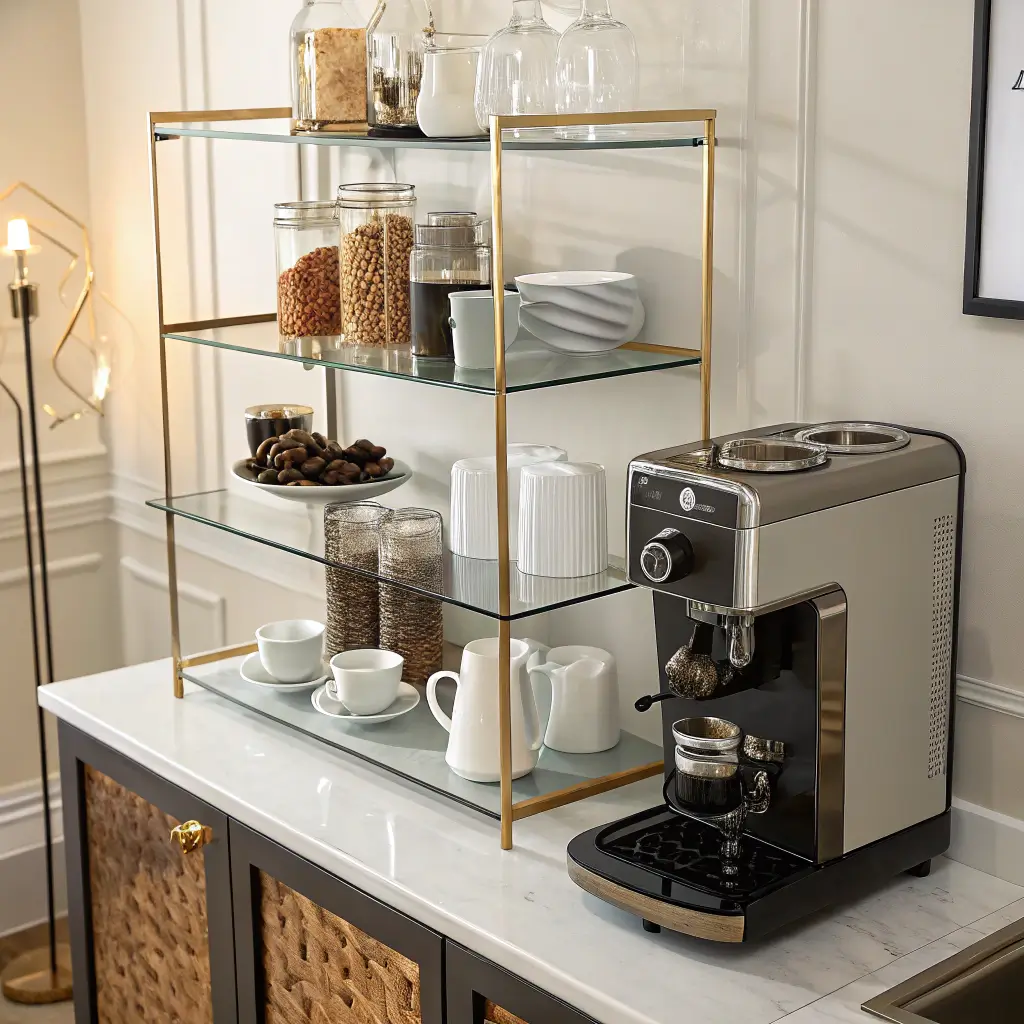 Use tempered glass shelves with chrome or brass brackets. The transparency keeps things feeling open and airy. Metal canisters, a stainless steel machine, and geometric accessories complete the look. The trick involves keeping everything extremely clean – fingerprints and coffee stains show immediately on these surfaces.