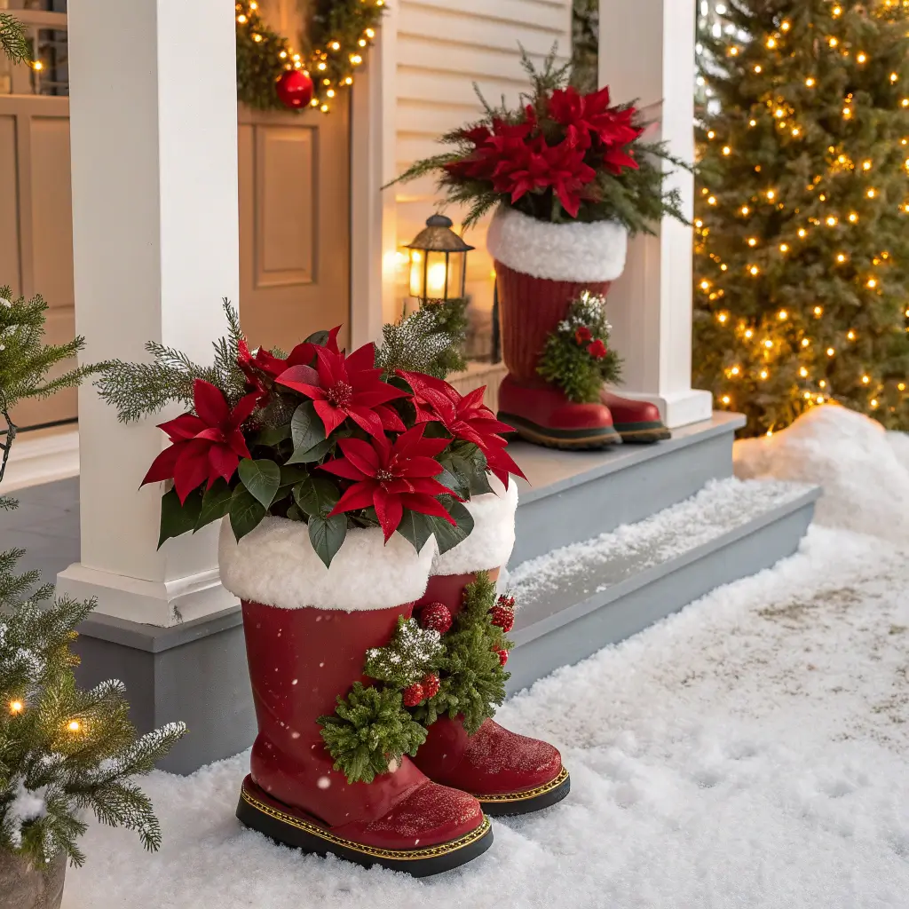 Paint old boots black, add a white fur trim (fake fur fabric and hot glue work perfectly), and throw in a red ribbon belt. Fill them with evergreen branches, holly, or even battery-operated light branches. Each boot takes about 20 minutes to transform, and they look absolutely adorable flanking your front door.