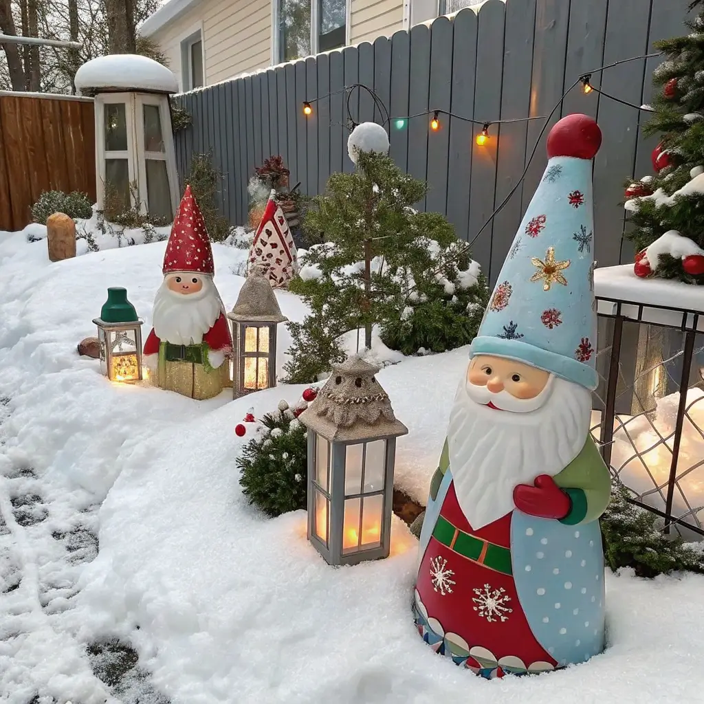 Garden gnomes meet Christmas spirit in this whimsical decoration idea. Those plain concrete garden statues hiding in your shed? Time for their holiday makeover! A little acrylic paint transforms boring lawn ornaments into festive focal points.