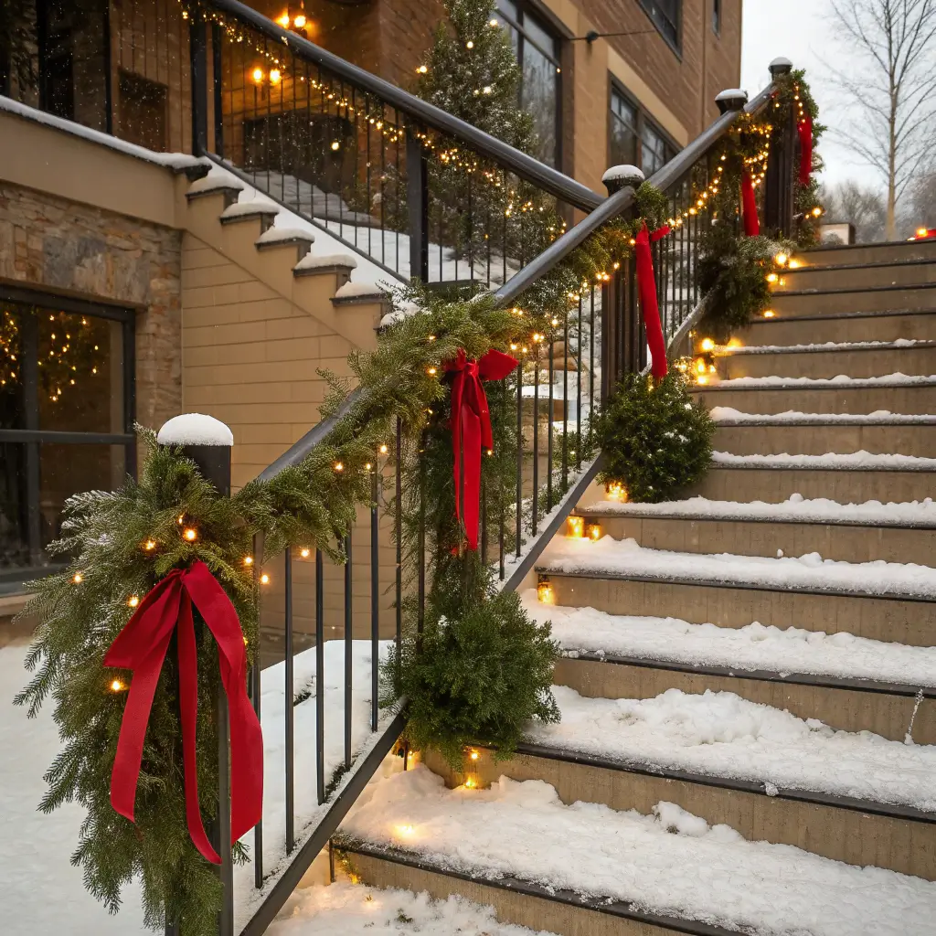 Secure branches along stair railings with zip ties or floral wire, weaving in battery-operated lights and red ribbons. Add pinecones and berries for texture. The whole process takes about an hour for a standard staircase.
