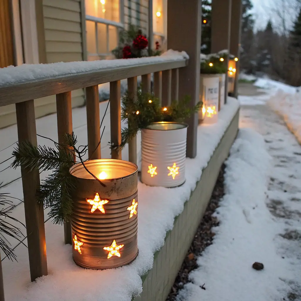 The ice prevents cans from denting while you work – genius, right? Create stars, trees, or abstract patterns. Spray paint them in metallics or Christmas colors, add sand and battery tea lights inside. Each luminary takes 15 minutes of actual work time.