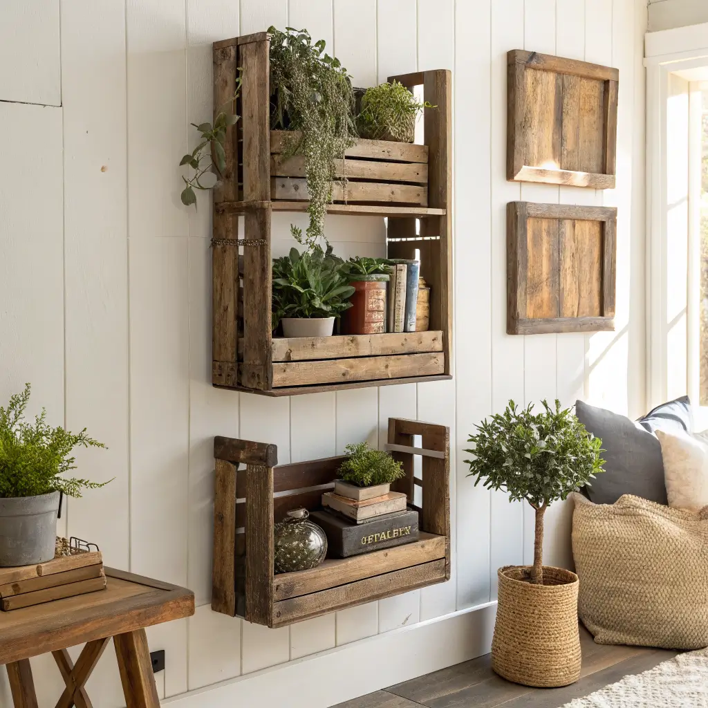 Let’s kick things off with my personal favorite – the rustic crate shelf. Remember those old wooden crates you see at flea markets and think, “What would I even do with that?” Well, here’s your answer.
