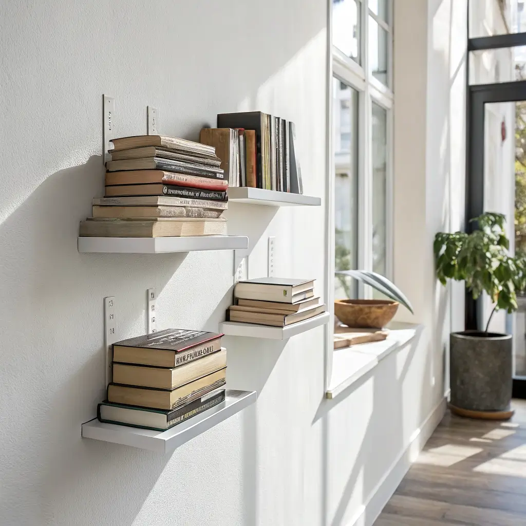 I’ve installed these in three different apartments now, and they never fail to spark conversation. Guests literally walk up and try to figure out how the books are staying up. The secret? A simple L-bracket hidden inside a sacrificial hardcover. Yeah, you have to sacrifice one book, but IMO it’s worth it for the effect.
