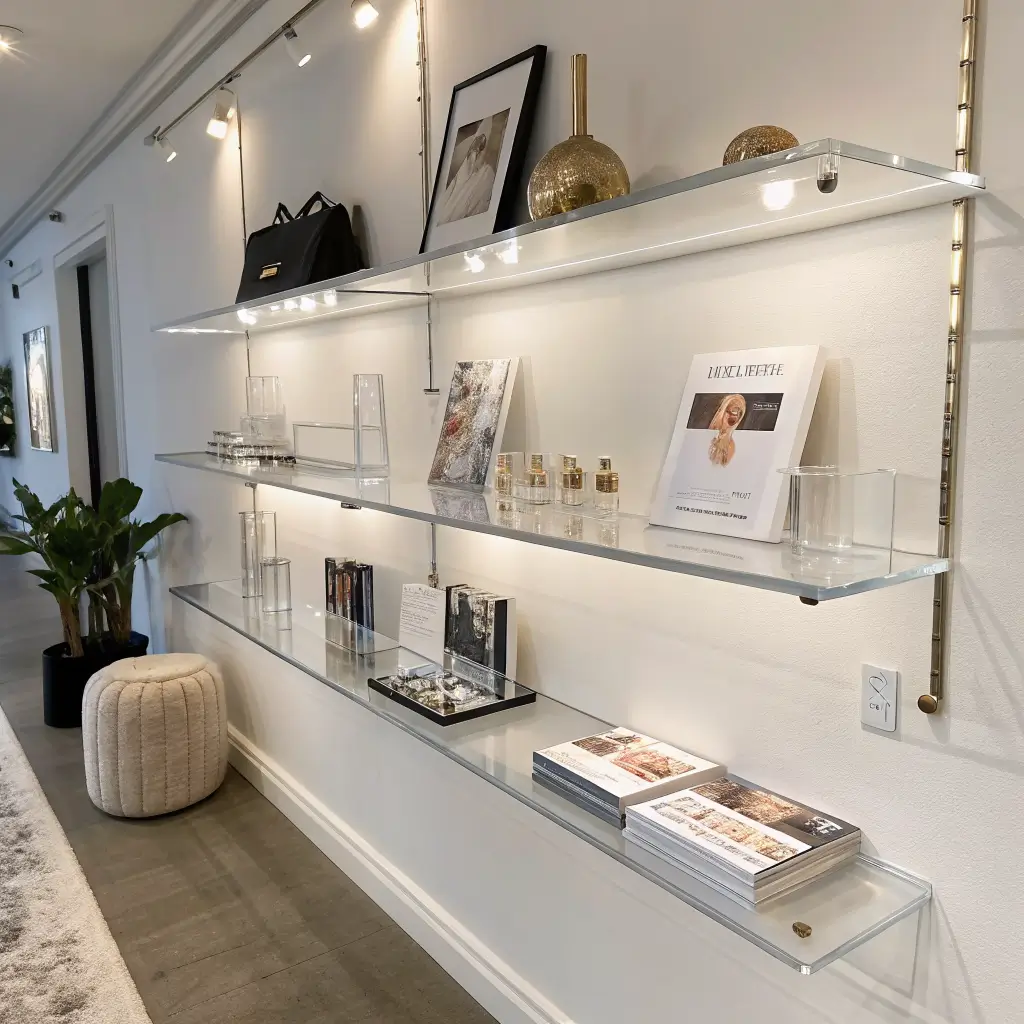 Want shelves that practically disappear? Acrylic shelves create this floating illusion that makes your items look like they’re suspended in mid-air. The transparent material keeps spaces feeling open and airy.
