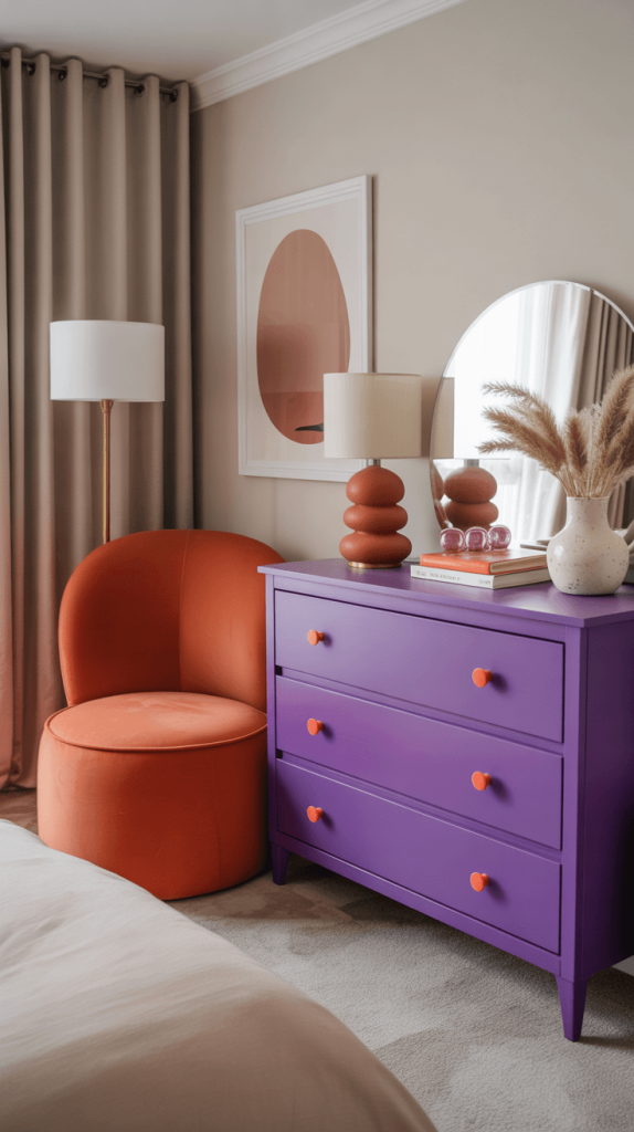 - Give It a New Life: See a sad, wooden dresser? Give it a glow-up with a coat of high-gloss purple paint and swap out the knobs for some funky ceramic ones.